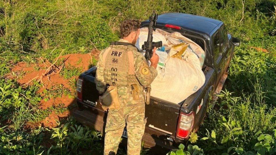 Os policiais tentaram fazer a abordagem, mas o motorista fugiu. Ele seguiu por estradas estaduais e rurais até entrar em uma lavoura, onde abandonou a caminhonete e escapou a pé pela mata.