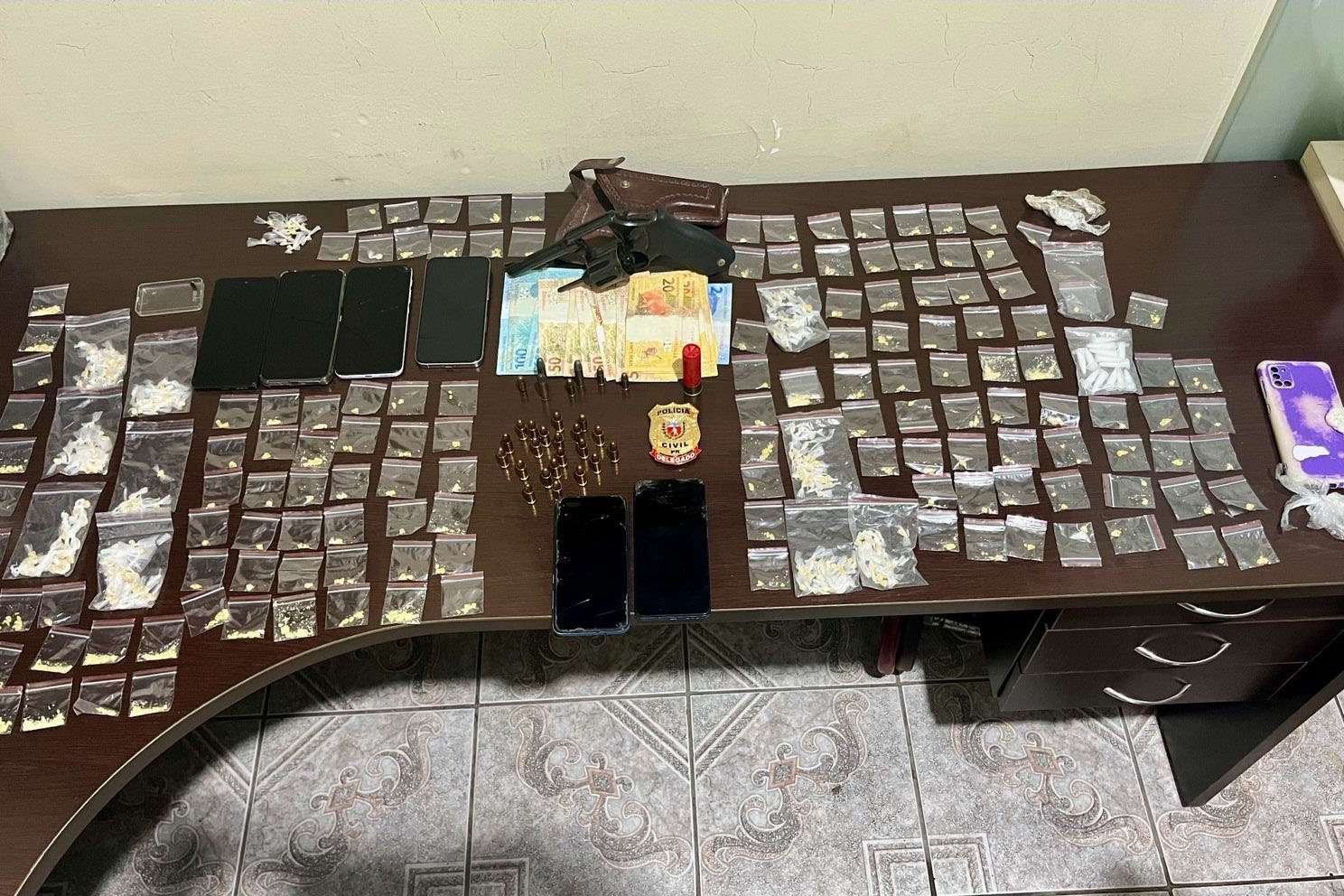 As diligências resultaram na localização de diversas porções de crack, cocaína e maconha, além de um revólver calibre .38 e munições dos calibres .38, .32, 12 e 9mm, sendo este último de uso restrito.