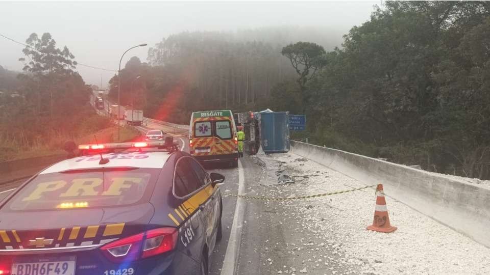 O motorista do caminhão morreu após o veículo tombar na BR-116 em Campina Grande do Sul, na Região Metropolitana de Curitiba, na tarde de terça-feira (02).