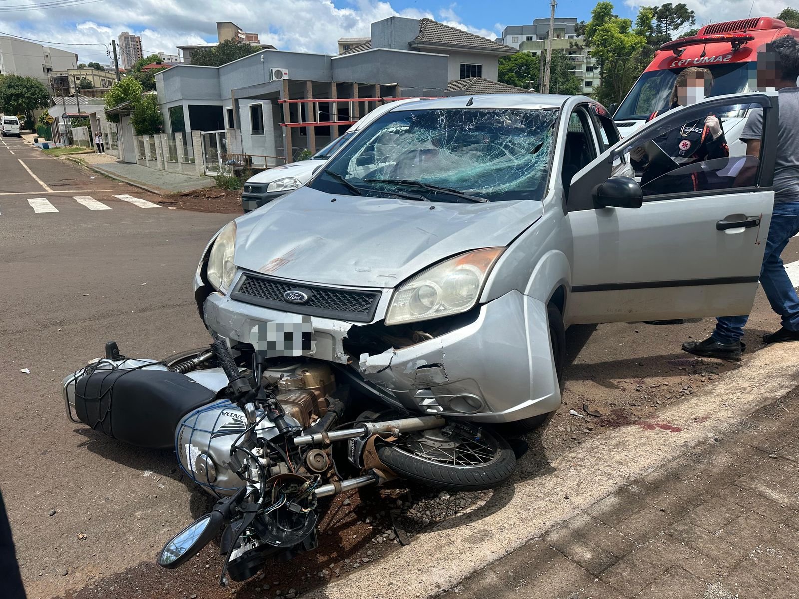 Um acidente de trânsito envolvendo um automóvel e uma motocicleta foi registrado por volta das 11h50 desta terça-feira em via pública, na Rua Padre Anchieta, nº 840, próximo ao Lago da Paz, no bairro Centro Norte, em Dois Vizinhos (PR).