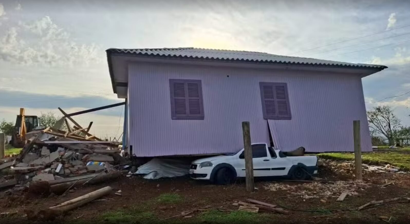 A residência deslocada pelo vento ficou com um dos lados sustentado apenas pelo veículo, que segue embaixo do imóvel na manhã deste domingo (21), segundo Eduardo Frederichs, coordenador da Defesa Civil de Barra Bonita. O procedimento de retirada deve ocorrer quando a chuva passar.