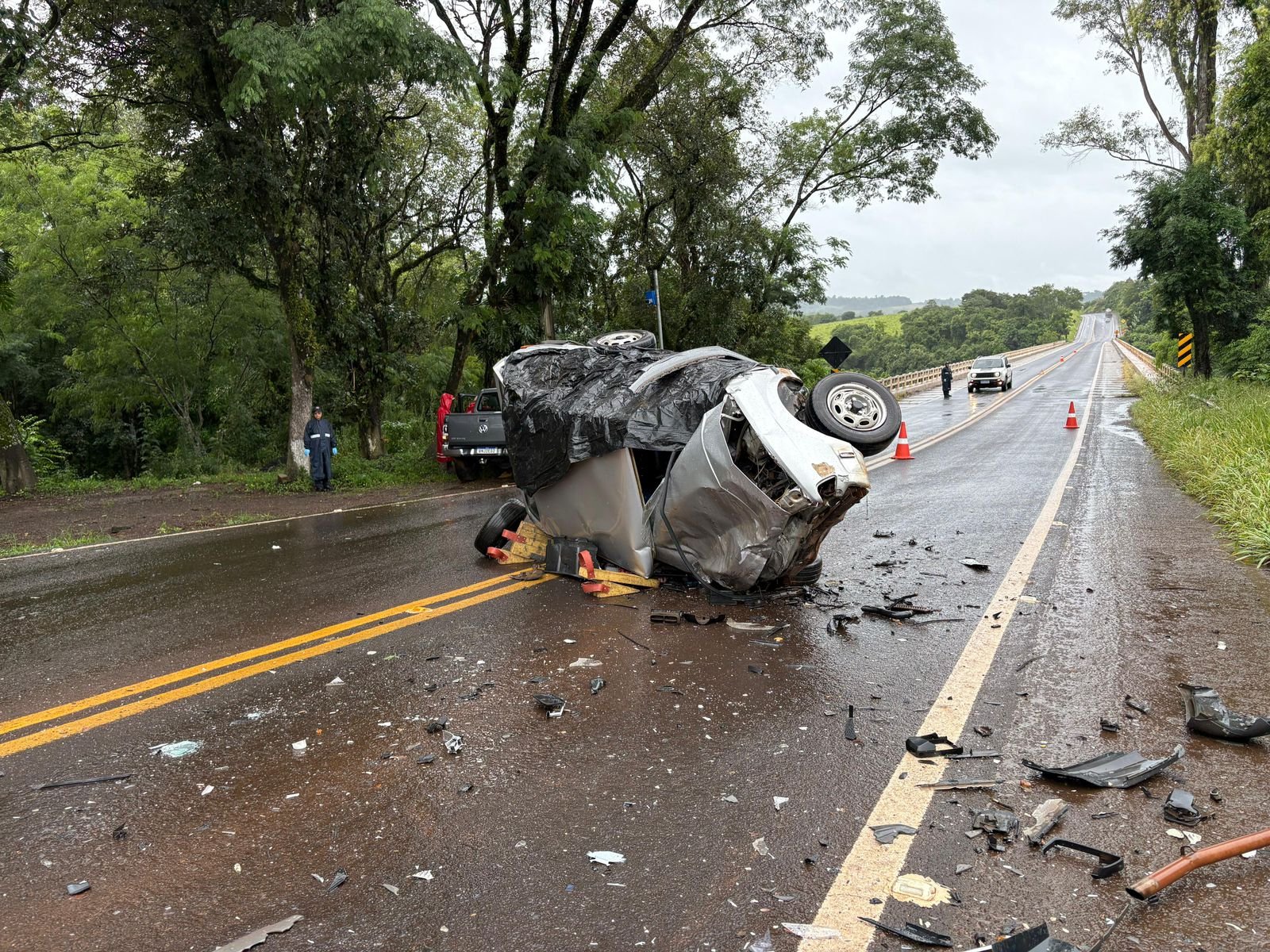 Equipes do Corpo de Bombeiros, do Samu e da Defesa Civil atenderam a ocorrência e prestaram os primeiros atendimentos. A área permaneceu isolada até a chegada da Polícia Rodoviária Estadual, da Criminalística e do Serviço Médico Legal, responsáveis pelos procedimentos periciais e pelo recolhimento dos corpos.