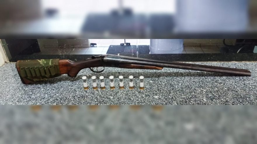 Ao chegar ao endereço, os policiais abordaram um homem em frente à casa. Ele confirmou possuir uma espingarda calibre 12 guardada no guarda-roupa, juntamente com sete munições intactas, todas sem documentação.