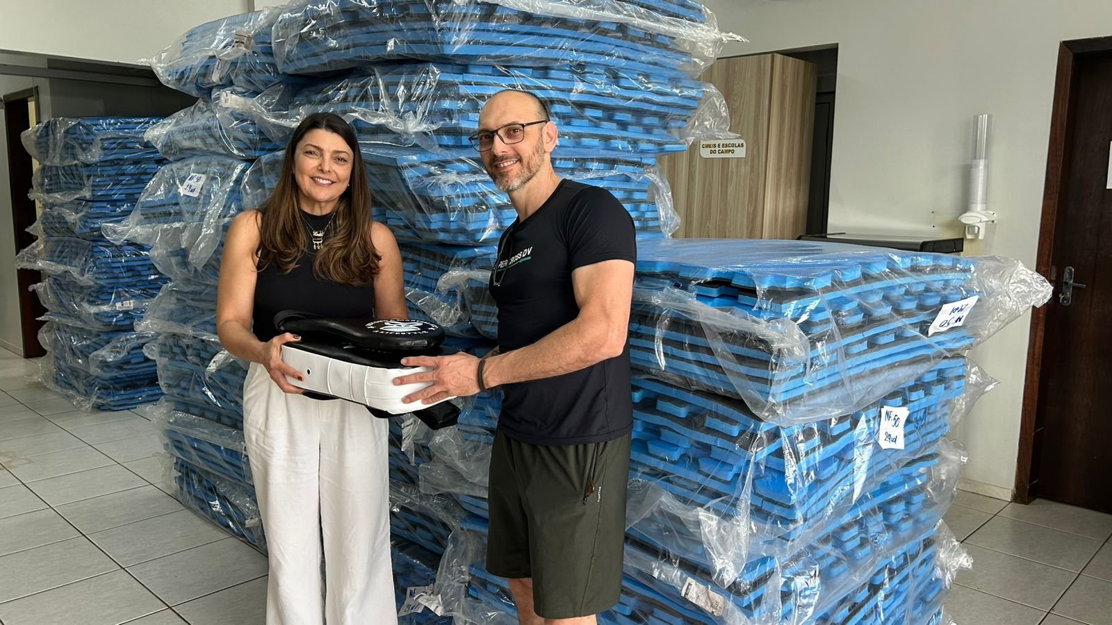 O professor Renan Restelatto, responsável pelas atividades, recebeu das mãos da secretária Leda Maria Ferrari um kit composto por raquetes e aparadores de chute, equipamentos indispensáveis para o aperfeiçoamento técnico das aulas. Além disso, a novidade mais aguardada foi a chegada dos tatames, que serão instalados nos espaços de prática, proporcionando mais segurança, conforto e qualidade aos treinos.