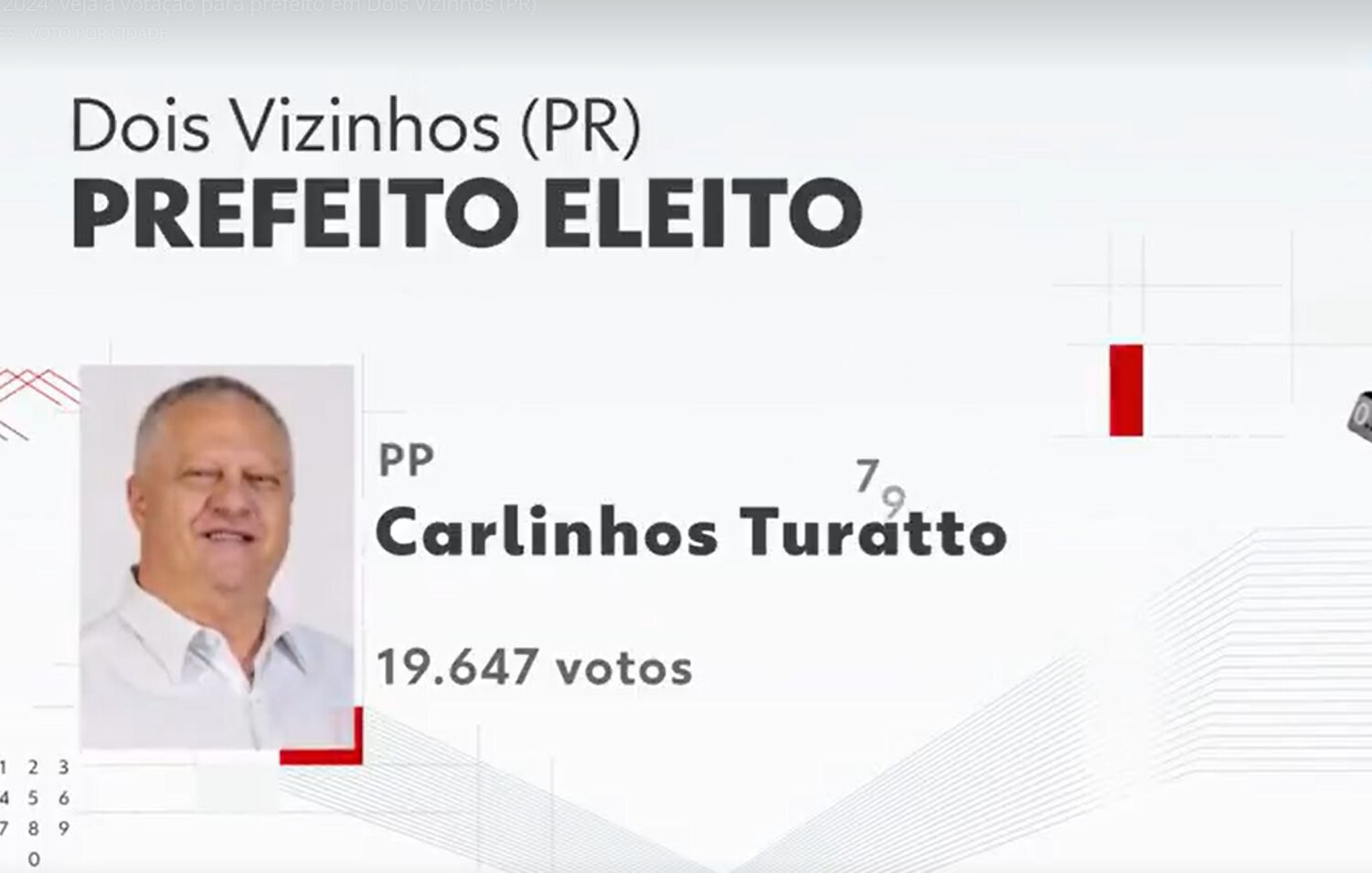 Carlinhos Turatto, do PP, foi eleito neste domingo (6) prefeito de Dois Vizinhos (PR) para os próximos quatro anos. Ao fim da apuração, Carlinhos Turatto teve 19.647 votos, 79,02% dos votos válidos (dados a todos os candidatos).