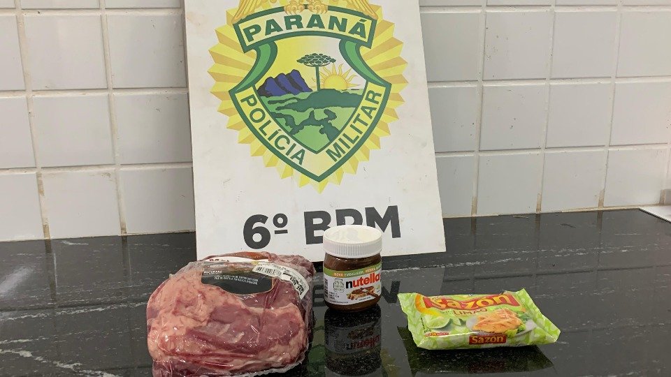 O suspeito subtraiu uma peça de carne, um pote de creme de avelã e um sachê de tempero pronto. O prejuízo estimado é de aproximadamente R$ 100.