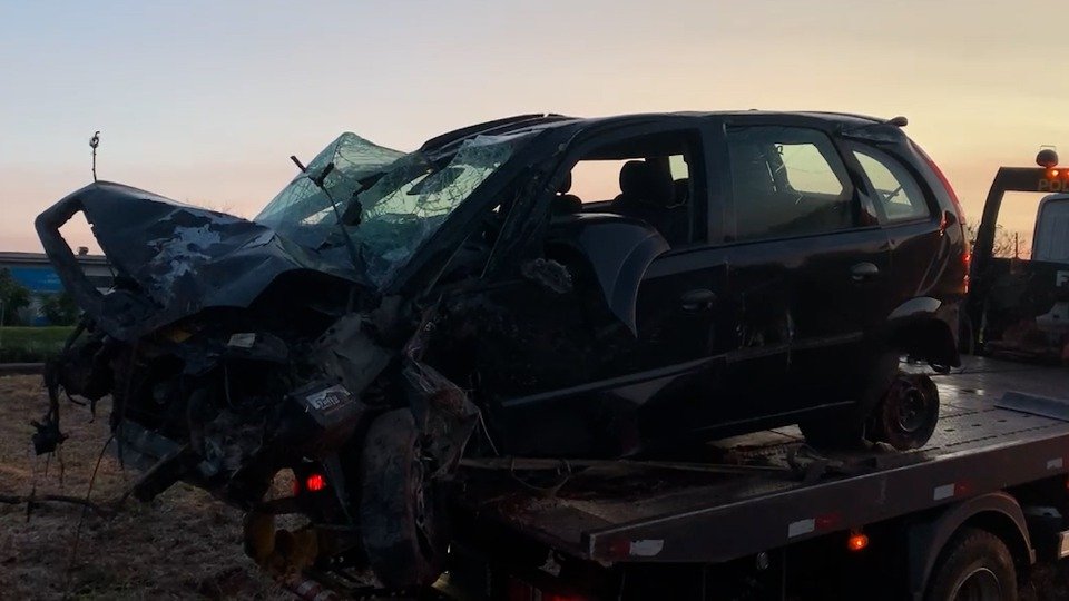 Alguns Kms depois, o condutor, um jovem de 19 anos, perdeu o controle da direção e bateu contra um muro às margens da rodovia. Com o impacto da batida, o Meriva ficou completamente destruído. Teve pneus estourados e roda deslocada.