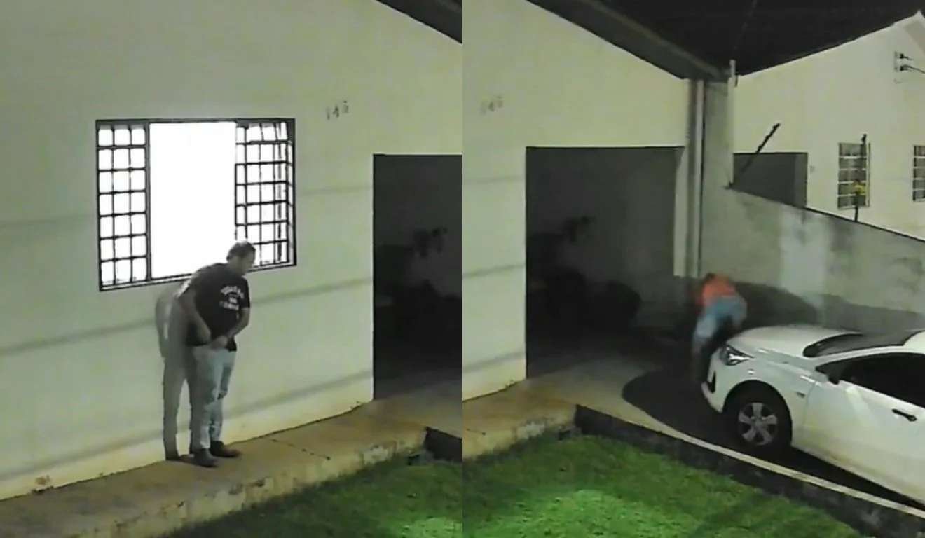 As imagens mostram o homem entrando no quintal, observando o local e, em seguida, invadindo a residência. A vítima estava sentada quando foi surpreendida. Um amigo que estava com ela reagiu e entrou em luta corporal com o invasor.