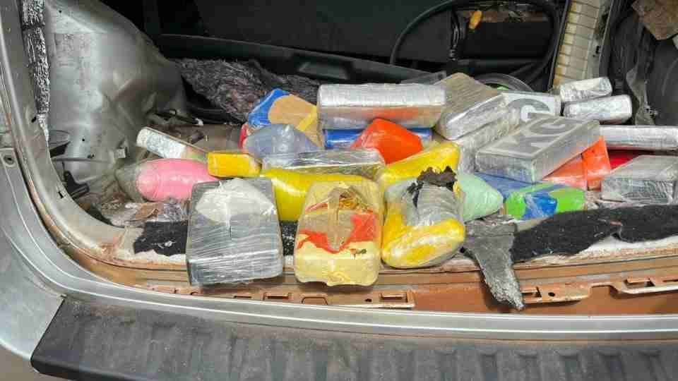 Durante a fiscalização, a equipe encontrou 54,3 kg de crack, 10,9 kg de cocaína e 5,4 kg de haxixe marroquino no carro.
