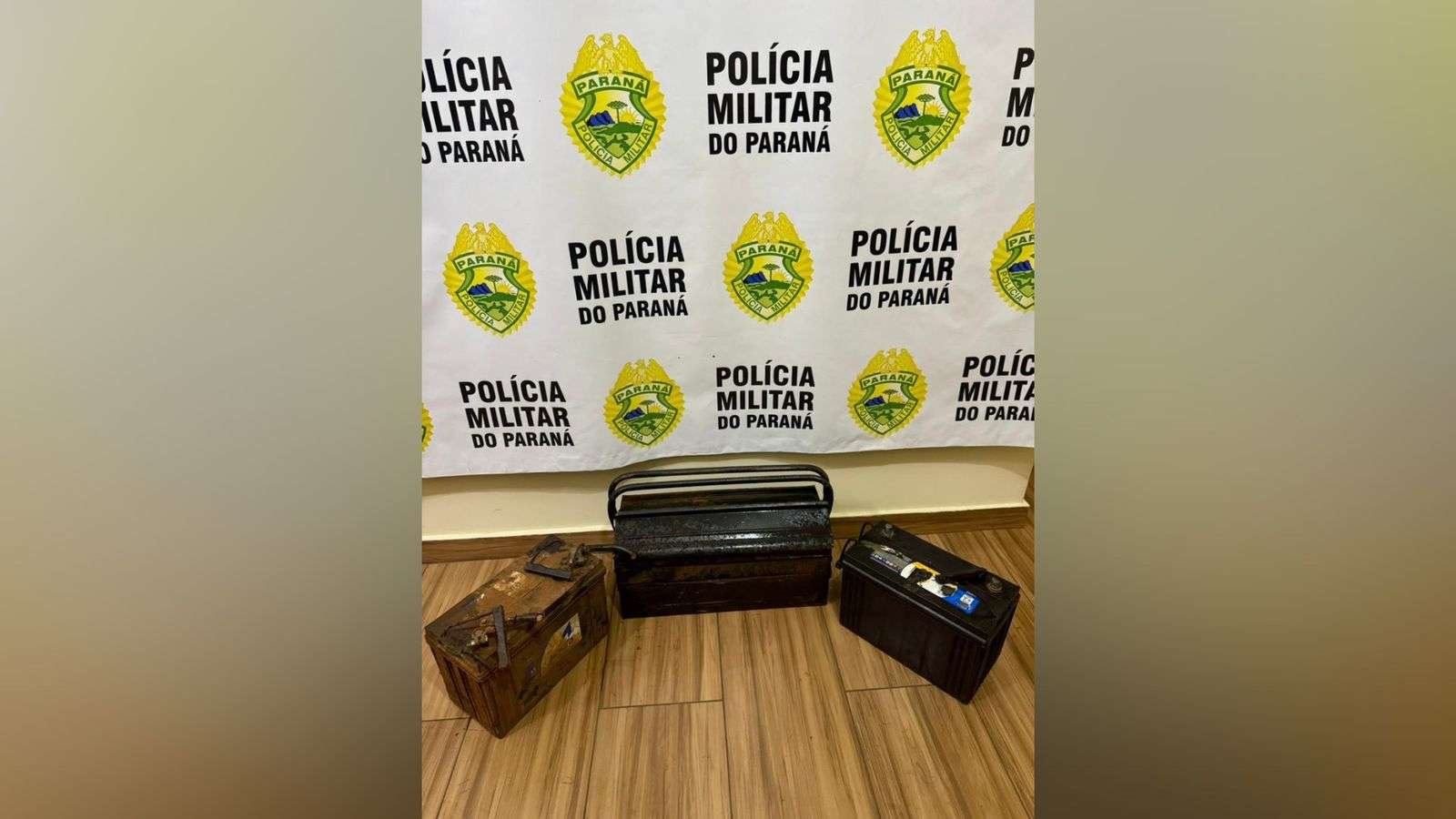 Diante disso, a equipe deslocou até o local informado pelo abordado, onde foi identificado o morador (45) que confirmou ter adquirido a bateria por R$70,00. Na sequência, foi deslocado ao segundo endereço, onde foi identificado o indivíduo (39) e localizada a outra bateria. O acusado do furto também indicou a localização da caixa de ferramentas que foi apreendida pela equipe.