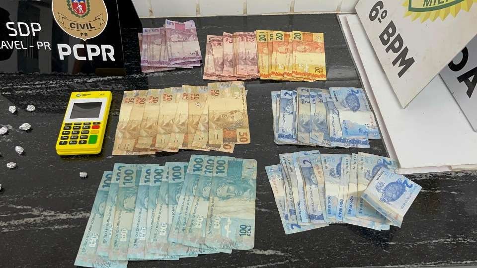 Durante a abordagem, os policiais encontraram pedras de crack, porções de maconha, dinheiro, uma máquina de cartão e um notebook. Mais detalhes sobre o caso ainda não foram divulgados pelas autoridades.