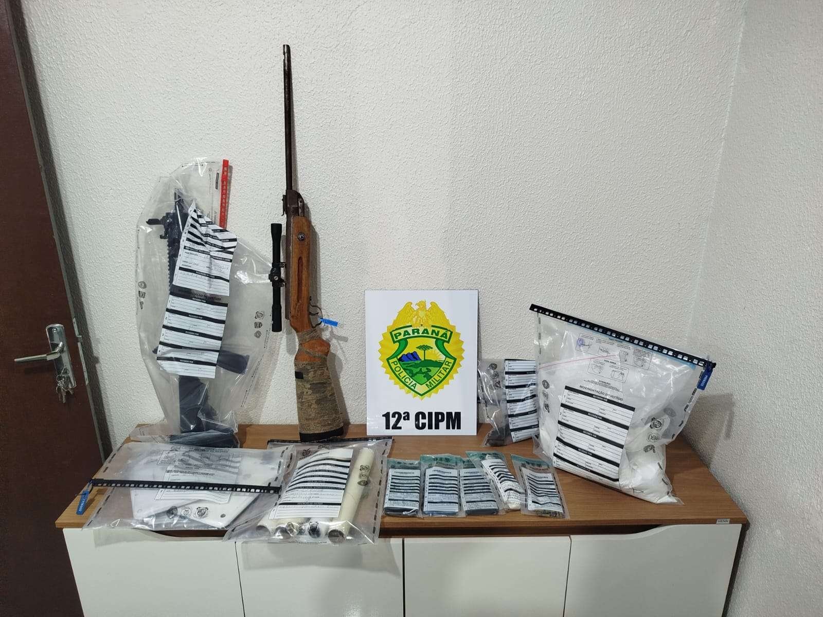 Uma ação integrada da Polícia Militar do Paraná resultou, nesta quarta-feira (3), na prisão de dois homens e na apreensão de drogas, armas e equipamentos utilizados para o preparo de entorpecentes. A operação, chamada “Cão de Faro”, contou com equipes da Patrulha Rural da 12ª CIPM, ROTAM/CANIL da 12ª CIPM, CANIL do 3º BPM e ROTAM do 21º BPM.