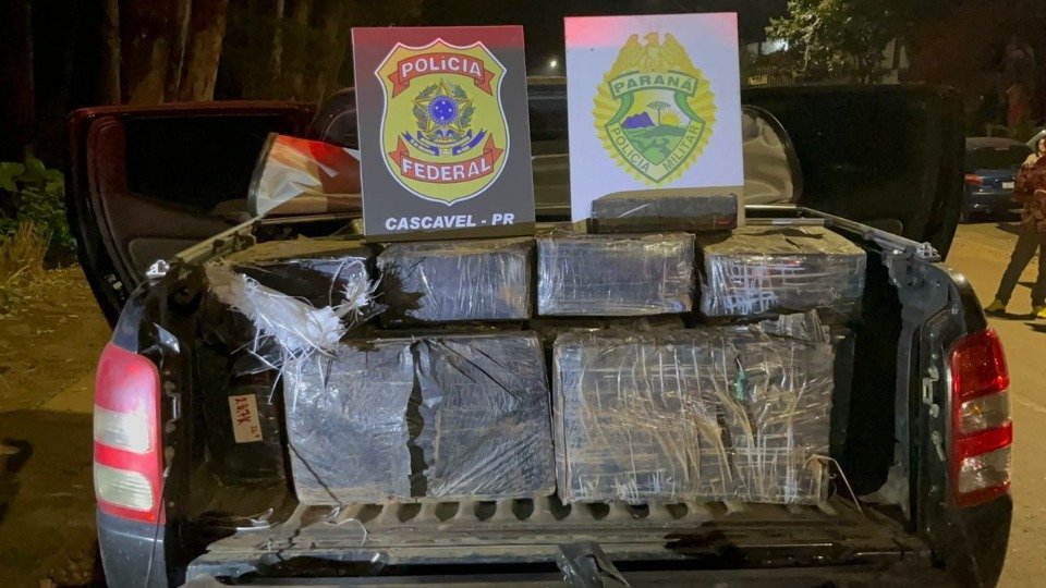 Caminhonete Mitsubishi L200 carregada com 1.075,5 tonelada de maconha foi abordada nesta quarta-feira (3) pela Polícia Militar em conjunto com a Polícia Federal, no bairro XIV de Novembro, em Cascavel.
