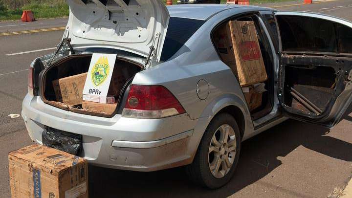 No local indicado, a equipe encontrou o automóvel e um suspeito manuseando caixas de cigarros contrabandeados. Ao perceber a presença policial, ele tentou se esconder na edícula da casa, mas foi localizado e preso em flagrante.