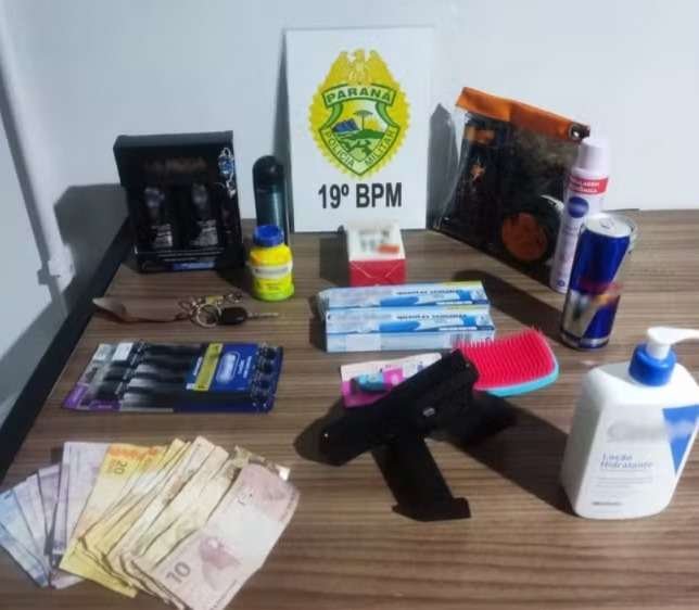 Com o suspeito, a polícia encontrou dinheiro. Dentro do veículo, foram localizadas as sacolas com os produtos roubados, além de R$ 384 em espécie e um simulacro de pistola preta.