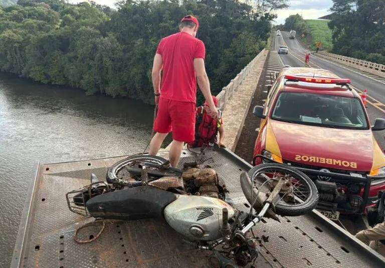 Uma motocicleta foi localizada no fundo do Rio Chopim, na divisa entre Dois Vizinhos e São Jorge d'Oeste, na tarde de sexta-feira (20), após um cidadão identificar o objeto durante uma atividade de pesca magnética.